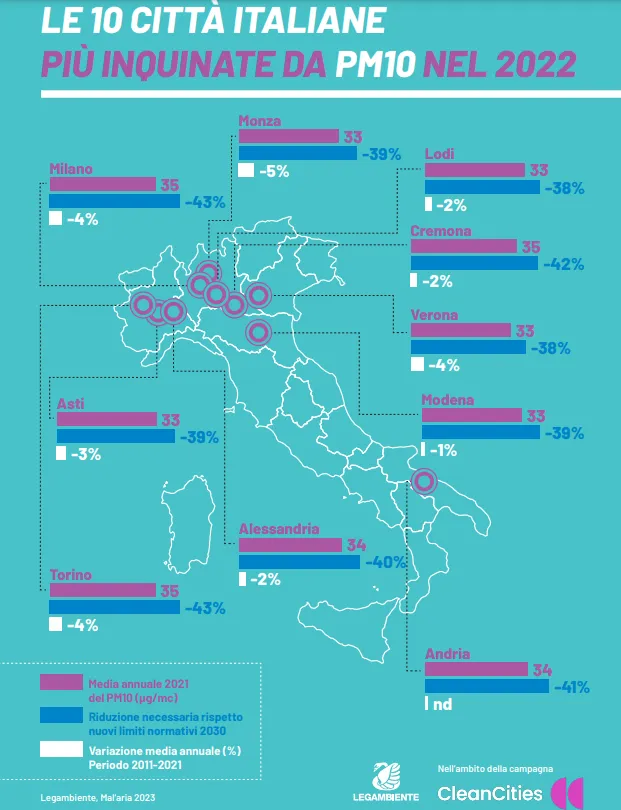 It seems to be so. This is the alarm that comes from the “Mal’aria di città 2023” report by Legambiente, the annual analysis about the state of atmospheric pollution in Italy’s provincial capitals. Air pollution endangers the health of citizens who are chronically exposed to excessively high pollutant concentrations. Starting with official data from the monitoring stations installed by the competent authorities in different municipalities, the report provides as complete a picture as possible of what air pollution was like in the year just ended. The year 2022, in fact, showed acute criticalities for some cities represented by the days on which the daily limit for PM10 (set at 35 days in a year) was exceeded, with a daily average concentration of dust exceeding 50 micrograms/cubic metre as required by current legislation As many as 29 cities have at least one control unit above the legal limit of permitted exceedances.