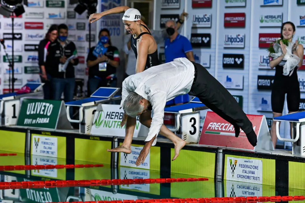 Italian Championships in the short tank, 2021. “When I see the scoreboard, I slap the water of the pool: yes, this time I did it! I look at Alberto and we burst into tears like two fools. Gold and new world record, 1’54’82”. The last race ended like the whole career: as a winner. Federica retired winning her medal number 130 among the applauses of the audience of Riccione, surrounded by her family and the people she loves most.