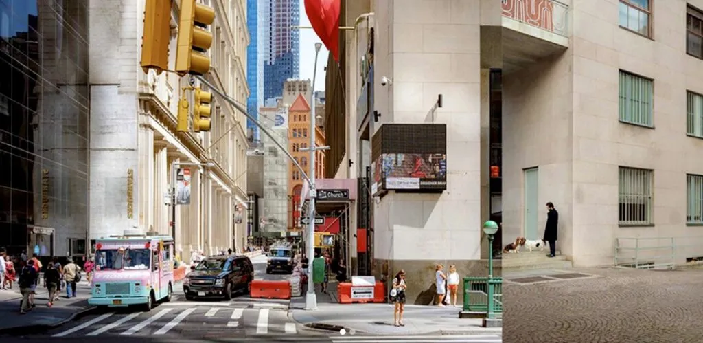 Men, women, and children appear between buildings, in houses, and on billboards, yet they are frequently distant and overwhelmed by the metropolitan expanses that surround them, almost as if they were too overwhelming for people. Many, probably too many, structures contrast with the lack of plants, emphasizing the city’s grey areas even more.