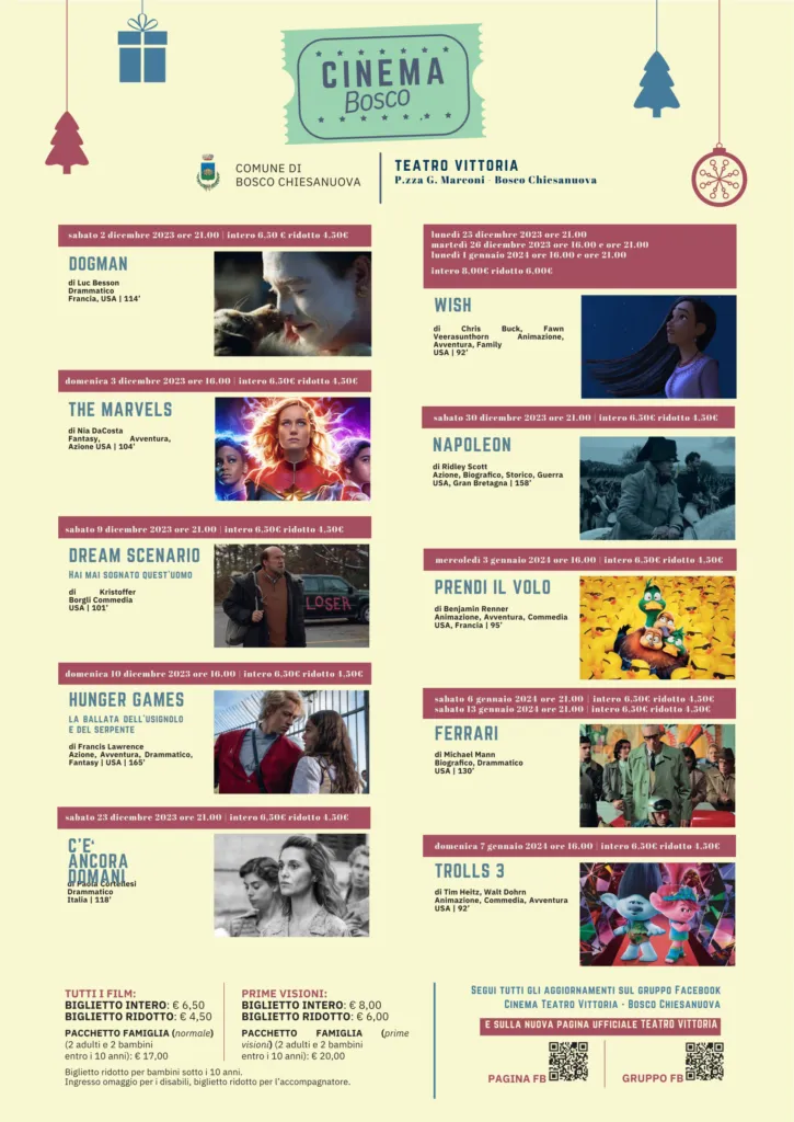 Bosco Chiesanuova is also home to the Teatro Vittoria cinema in the main square, Piazza Guglielmo Marconi 35. Popular films are shown during the festive period. The Teatro Vittoria is a modern and functional structure with 343 seats.
