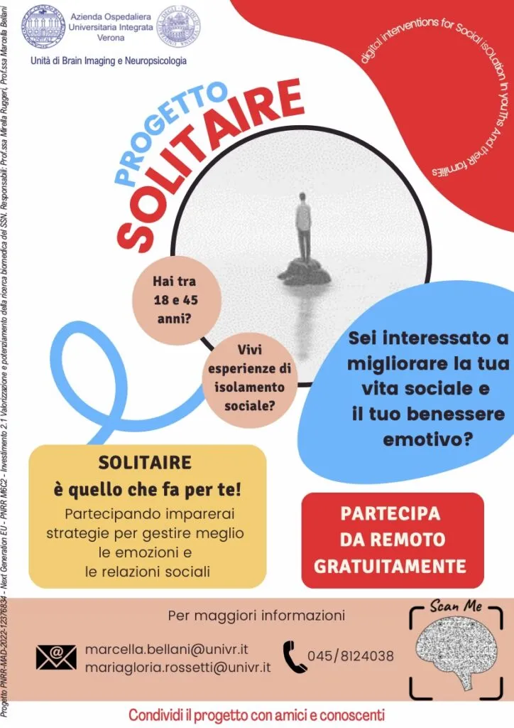 Through online psychotherapy combined with cognitive rehabilitation programmes, the SOLITAIRE project offers isolated young people the opportunity to improve their emotional and social skills, helping them to reintegrate into society. The programme, which is completely free of charge, also offers psycho-educational support for family members, who are invited to participate. Those interested in receiving support can contact the team (also in English) by phone at (+39) 0458124038 or by email at marcella.bellani@univr.it or mariagloria.rossetti@univr.it.