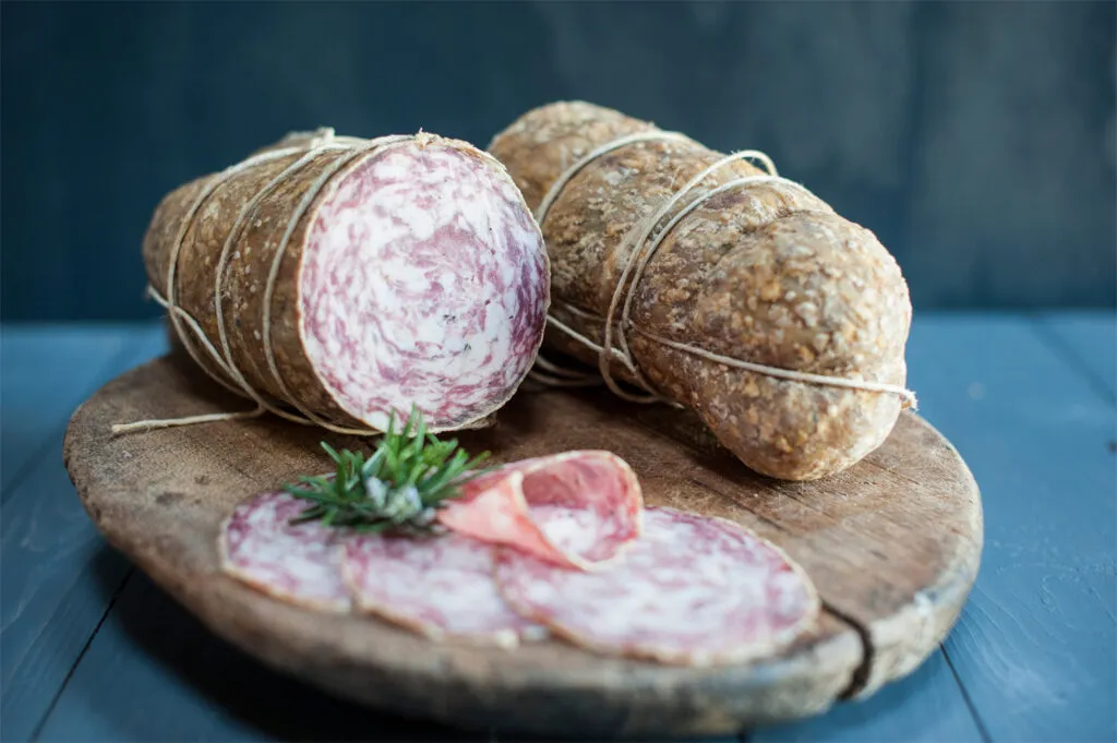 The pork meat is carefully selected and minced. It contains a fat content of 25 to 30% of the total, and is mixed with pepper, garlic, and salt. The mixture is stuffed into beef entrails, expanding them. Before being hung to mature in an environment with a constant temperature of 16–20 degrees Celsius, the outer casing is tightened with string and then pierced with tiny holes to allow it to dry inside. The ageing process gives it a greyish-white colour, due to the mould that covers it. The maturation lasts from 6 months to 3 years. It is then consumed after being sliced on a cutting board. The meat appears pinkish, with characteristic irregular white marbling due to the fat content.