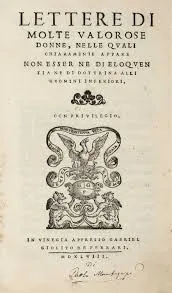 LETTERE DI/ molte valorose/ donne, nelle qvali. chiaramente appare/ non essere ne di eloqven/tia ne di dottrina alli/ hvomini inferiori./ [fleuron]/ con privilegio./ [marque : della mia morte eterna vita vivo – semper eadem]/ in vinegia appresso Gabriel/ Giolito de Ferrari./ mdxlviii.